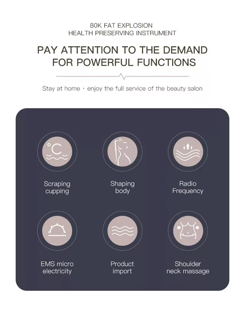 Ultrasonic strong sound wave of 40000HZ may be emitted to vibrate fat cells at top speed and produce numerous vacuum air pockets inside and outside of the fat cells. With its effective technology dissolves fat, and lymphatic drainage, enhances blood circulation and reduces cellulite to keep your perfect body figure.