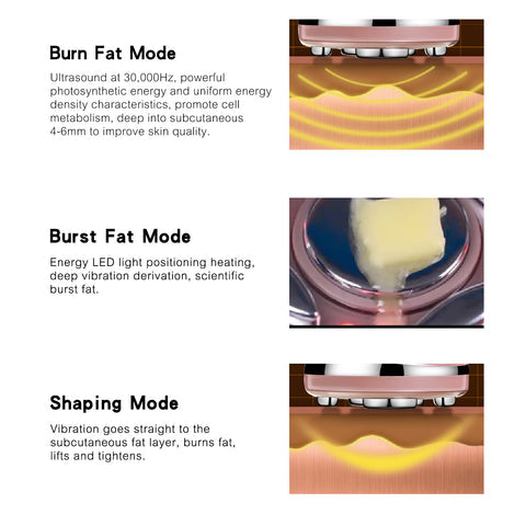 Mechanical vibration VIB + Ultrasonic CV function(intermittent mechanical short vibration, intermittent mechanical long vibration, mechanical long vibration, three gear) SculptSkin uses leading edge technology to help you reduce fat in targeted areas, and reshape them. The Non-Invasive procedure liquefies stubborn fat without invasive surgery. Treatments have results in as little as one session, with quite painless.