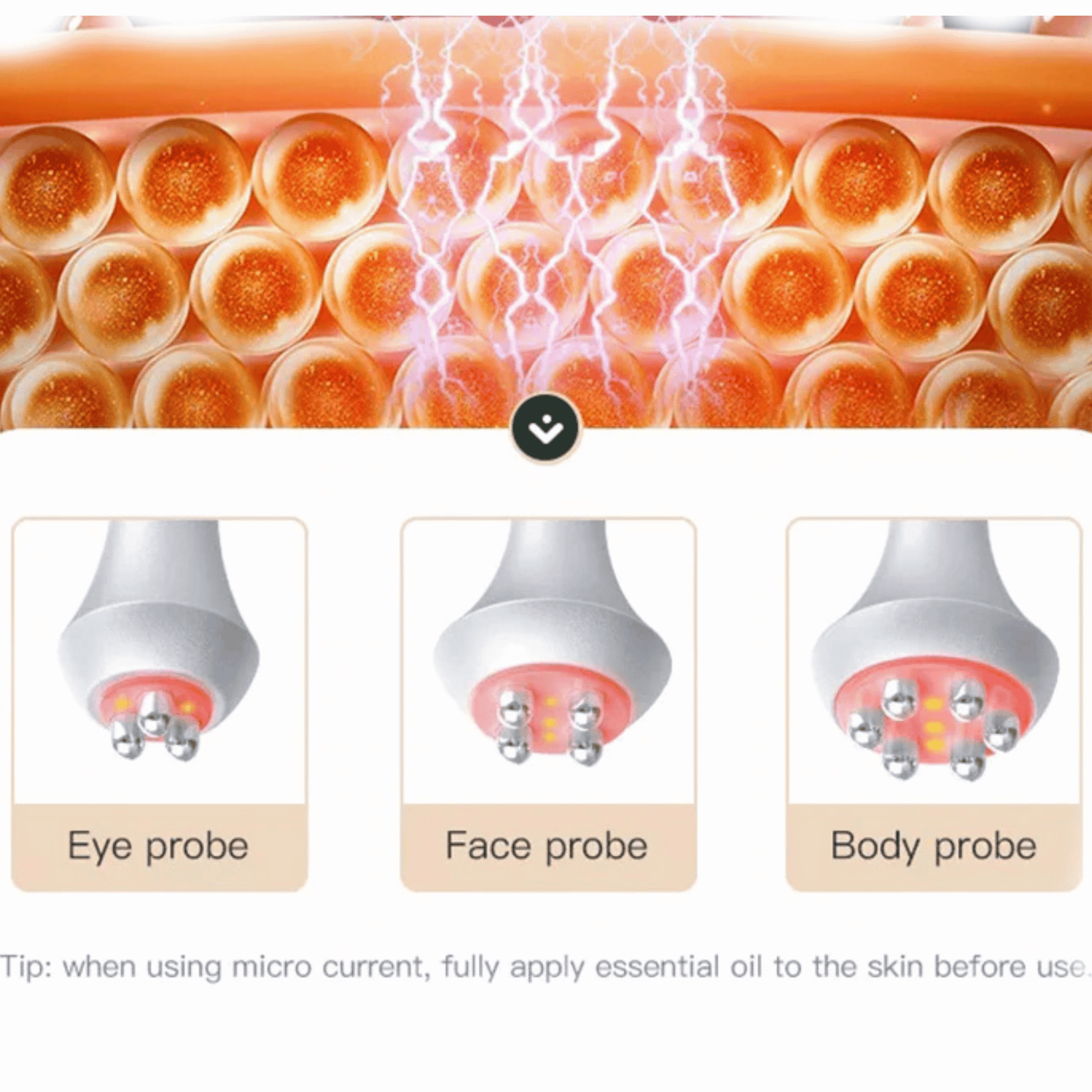 Radio frequency emitter is pressed up against the skin. These radio waves get past the outer skin layers and deliver heat energy to the muscles and tissues beneath. The overall result tightens up the outer layers of skin and reduces wrinkling effects.